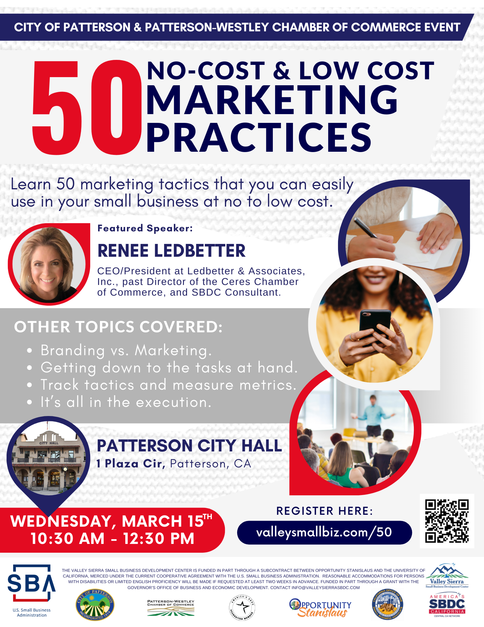 Workshop is presented by Valley Sierra SBDC, the City of Patterson, and the Patterson-Westley Chamber of Commerce.